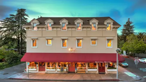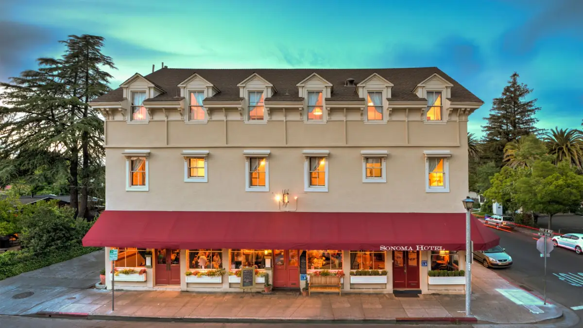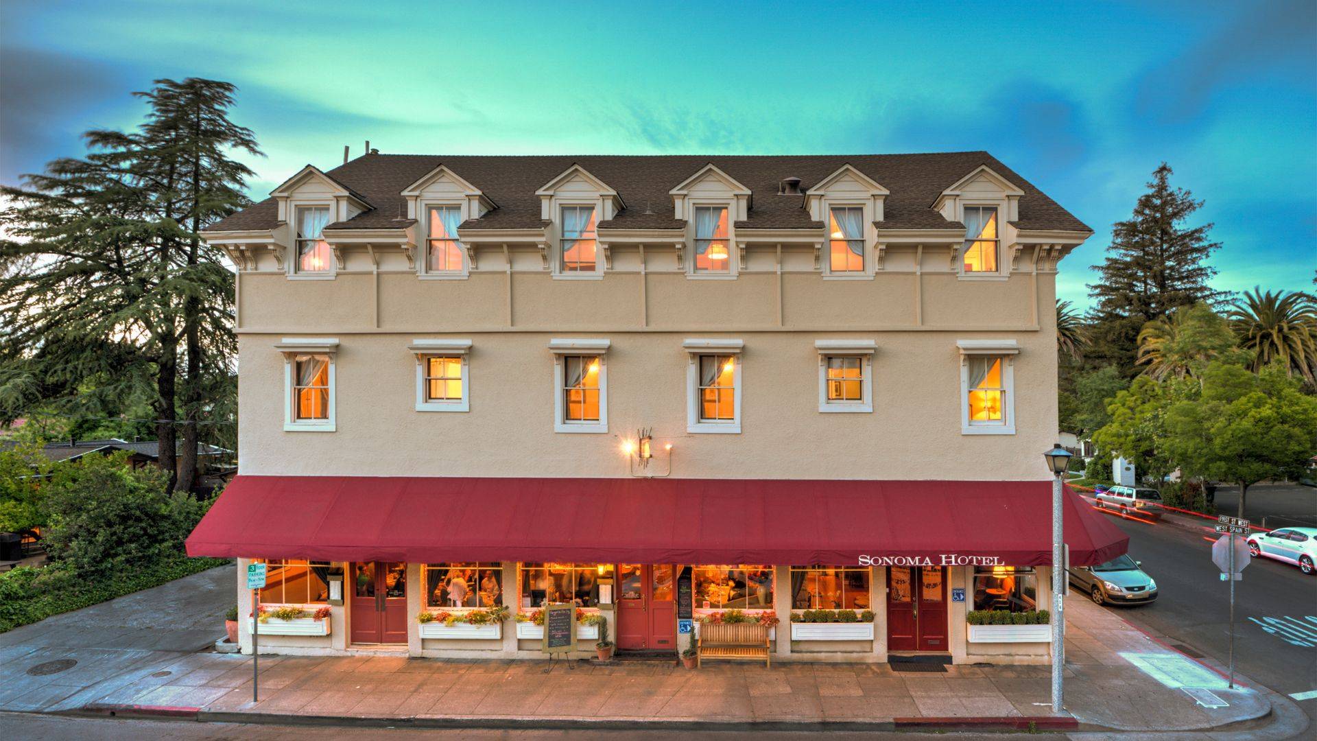 Outdoor view of a large three story beige hotel building with a red canopy and golden light coming through the windows